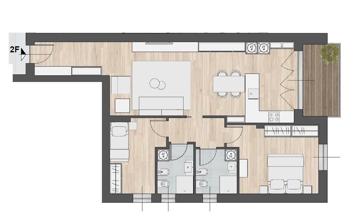 L'immobile posto al piano primo ed è composto da un' ampia zona giorno di 41 mq ,2 camere da letto e doppi servizi .