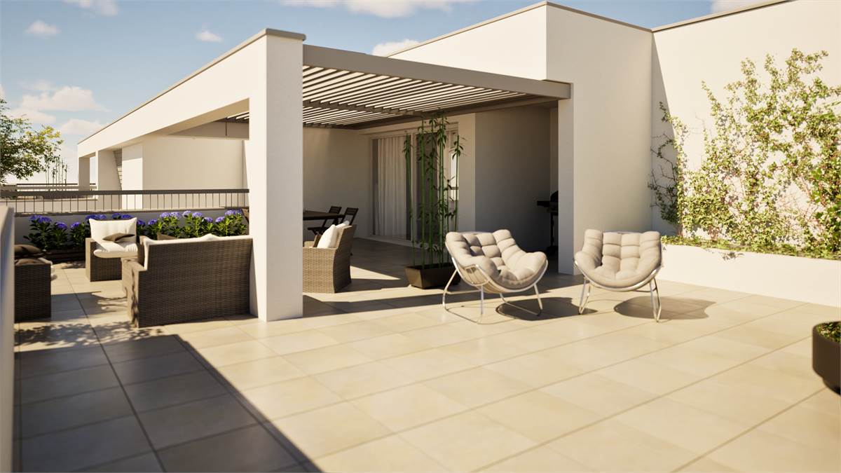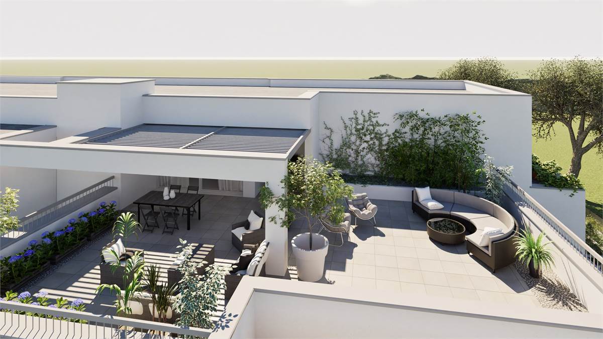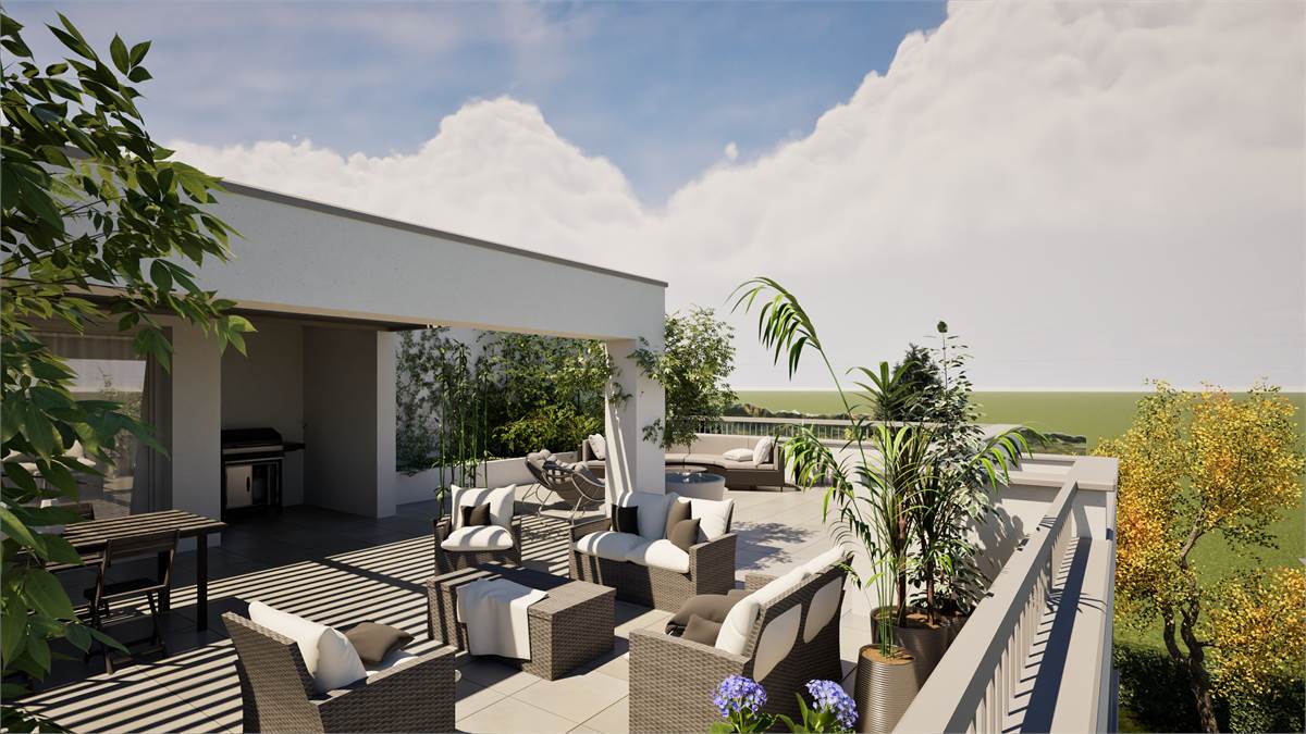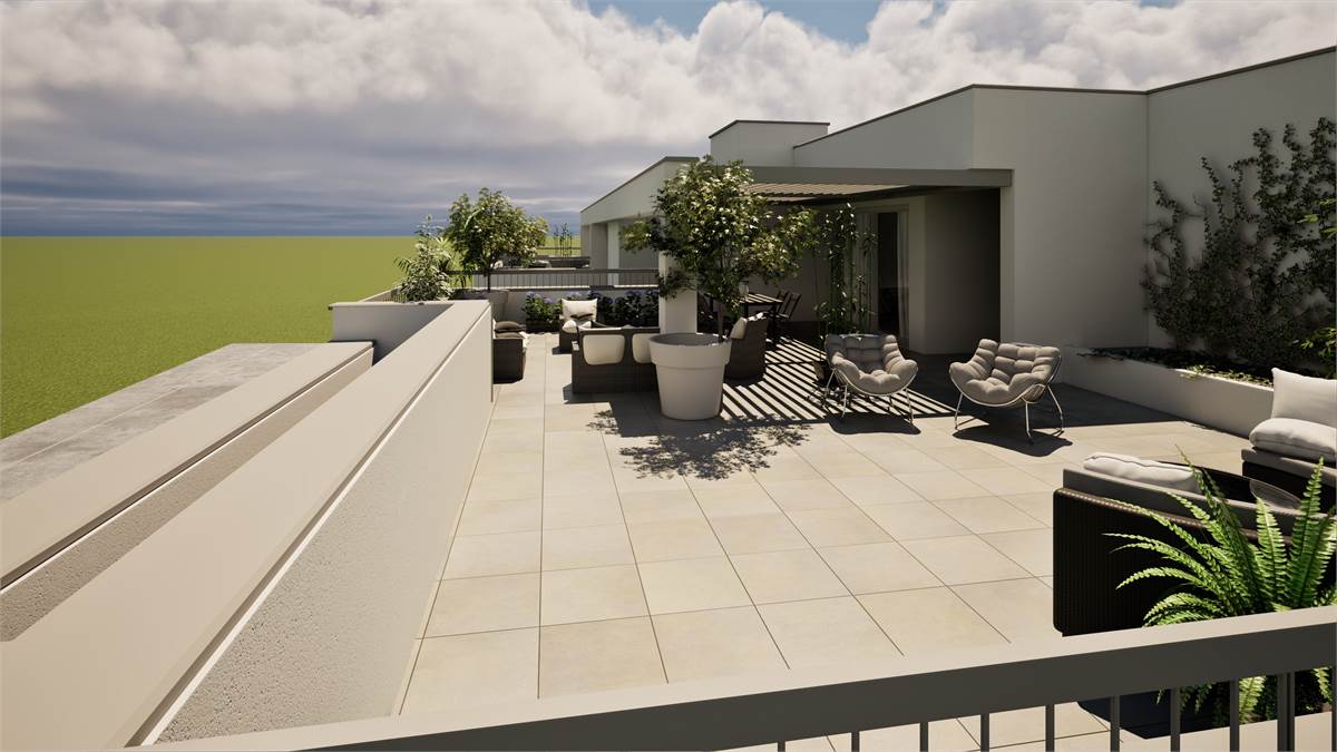 La zona giorno si completa di un terrazzo di 124,80 mq ideale per trascorrere momenti conviviali e conversare con parenti e amici o in totale relax godendosi un ambiente verde poco distante.