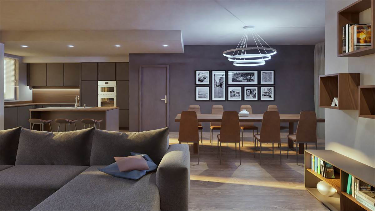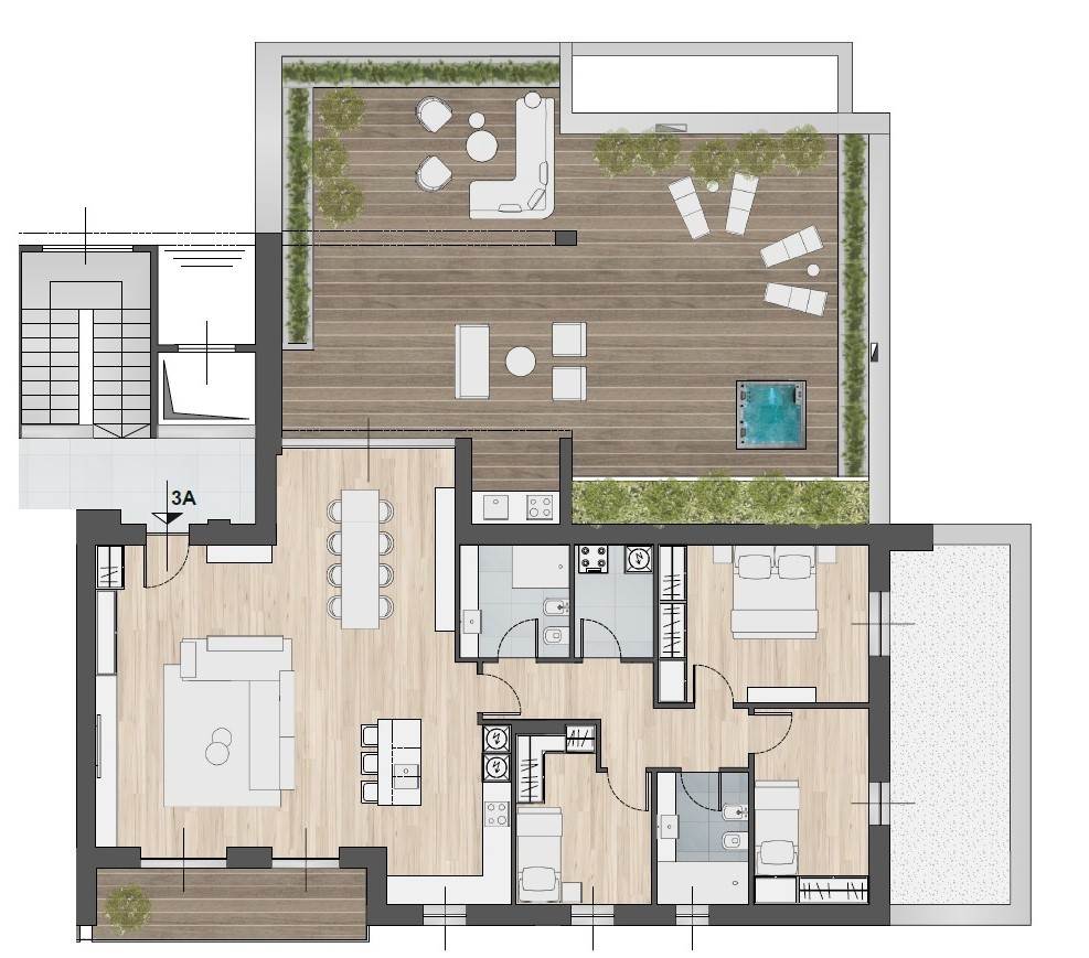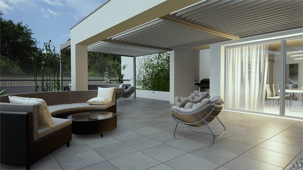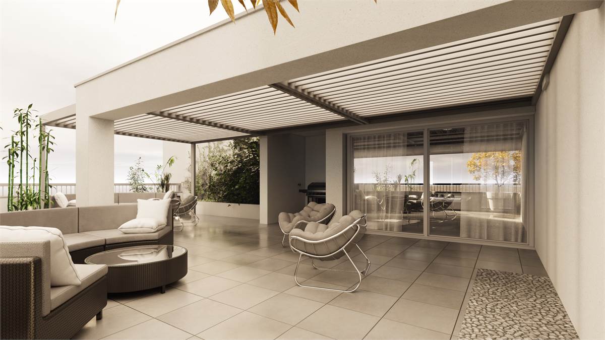 La zona giorno si completa di un terrazzo di 124,80 mq ideale per trascorrere momenti conviviali e conversare con parenti e amici o in totale relax godendosi un ambiente verde poco distante.
